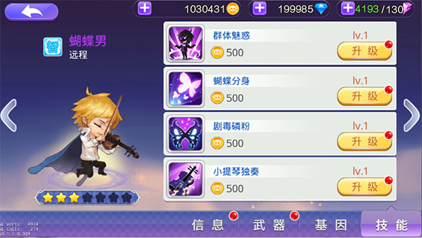 蝴蝶男的主动技能会发挥自己高富帅的魅力,魅惑场上敌人,使敌人进入眩晕状态,在眩晕状态结束后,对敌人造成200%的腐蚀伤害。蝴蝶男不仅主动技能强力,被动技能同样表现不俗,他可以召唤蝴蝶分身,让小蝴蝶在战场上四处乱飞攻击敌人,死亡时更会自爆杀伤周围敌人,还可以释放剧毒磷粉,在降低敌人腐蚀抗性的同时,造成腐蚀伤害。小提琴独奏状态下的蝴蝶男,会持续拉动小提琴,缓慢向敌人追击,还能对周围造成音波半径,并杀伤音波范围内的敌人;他在独奏两秒钟后还会传送到随机目标身边进行追击。