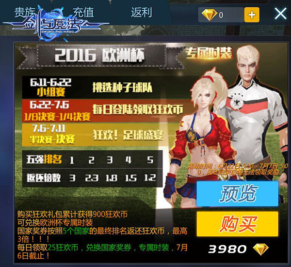勇士攒够一定数量的“欢乐币”可换取自己热爱的足球队时装!多余出来的“欢乐币”也是很重要的,在“剑魔”欧洲杯专属活动期间,勇士们一定要注意多积攒,因为它在“欧洲杯专属活动”结束之后可能会发出很大作用!