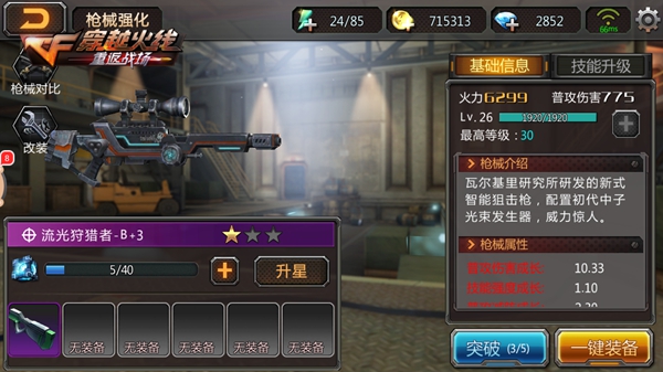流光狩猎者是一把狙击枪,初始品质就是紫色B级枪械,通过改装最后可以达到SS级的品质。时尚的外观和强悍的属性,是玩家必须培养的一把极品狙击枪。