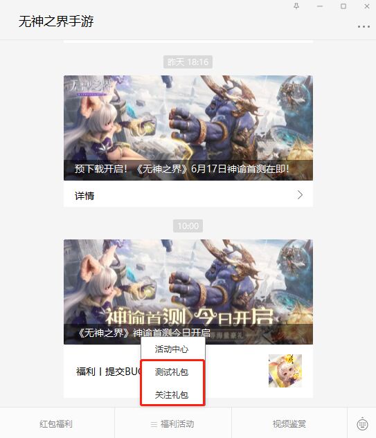 为了助力各位神谕者在本次测试中有更好的体验,我们准备了大量福利在微信公众号,请各位亲爱的神谕者前往微信公众号“无神之界手游”,点击底部菜单“福利活动”中的“测试礼包”及“关注礼包”按钮领取。系统将自动发放该活动的三个礼包码哦。